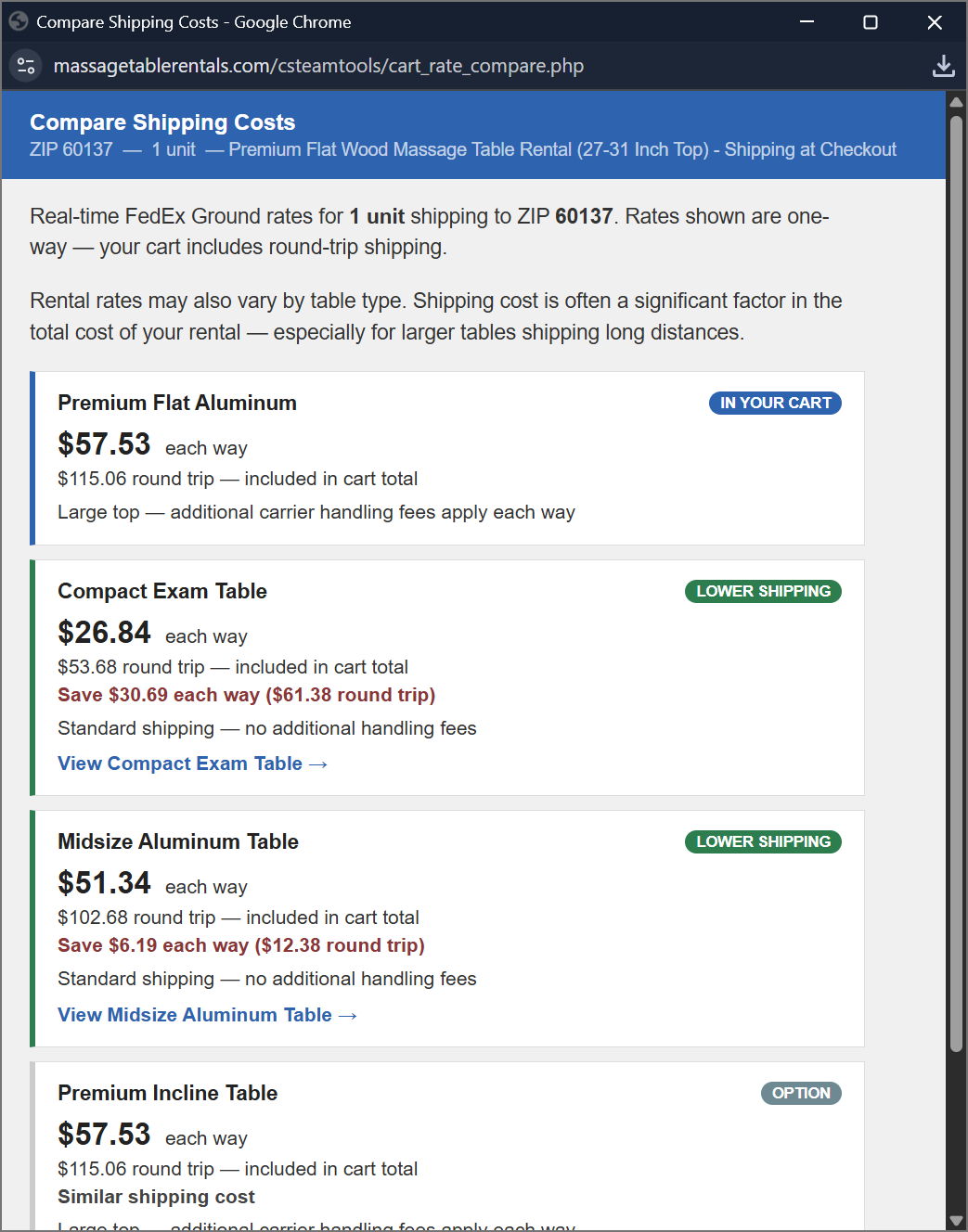 We also offer a comparison pop-up in the shopping cart so you can see what the shipping rates would be if you changed to a bigger or smaller table.